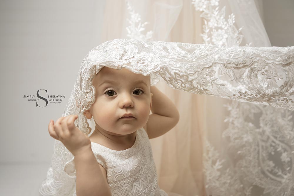 As an Oswego Photographer, I love to create the vision mom has for her little one’s milestone session. Even if that means portraits with mom’s wedding dress! Adeliade wore mom’s lace as a veil, and we captured the perfect moment of the two combined. An heirloom treasure for sure!