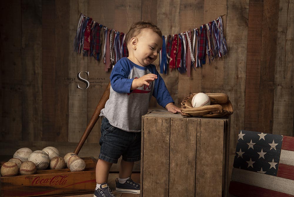 What’s more American than apple pie?? How about an apple pie smash teamed up with America’s favorite past time, baseball?? Cael’s mama put together a unique and memorable 1-year milestone session for her little man’s 1st birthday portrait session. Cael played ‘catch’ with me as we rolled the balls back and forth to each other during his session.