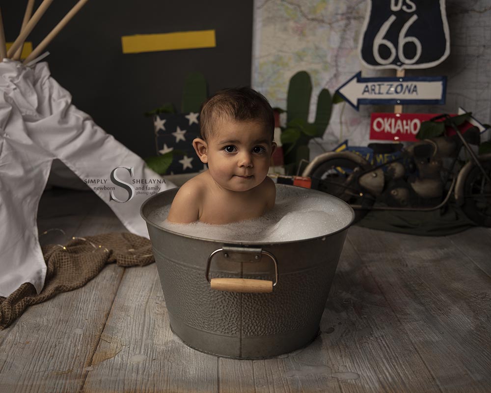 Bubble bath time! Route 66 cake smash | Utica NY Baby Photography